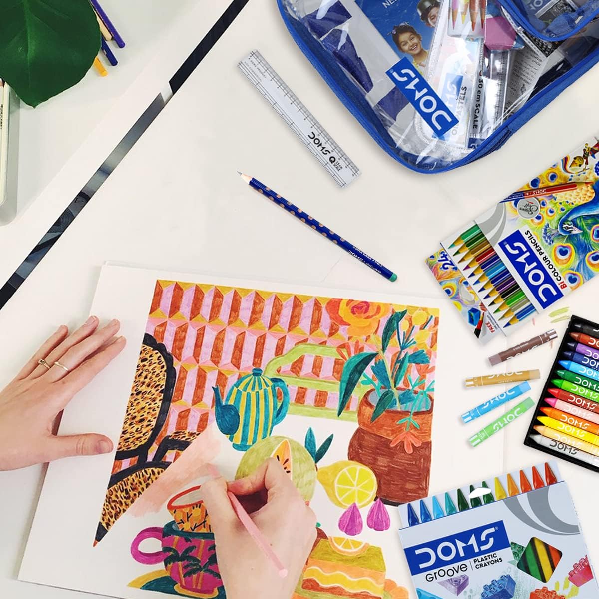 - 1 Drawing book, 5 Pencils, 12 Colour Pencils, 12 Oil Pastels, 12 Plastic Crayons, 1 Retractable Eraser, 1 Scale, 1 Pencil Sharpener, 12 Wax Crayons